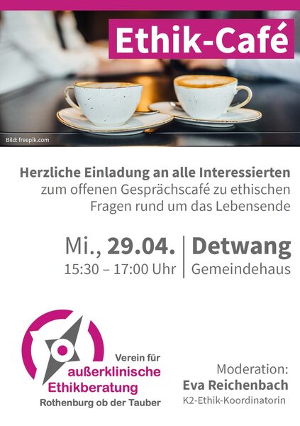 Herzliche Einladung an alle Interessierten zum offenen Gesprächscafé zu ethischen Fragen rund um das Lebensende. Moderiert wird die Veranstaltung von Eva Reichenbach. Wir freuen uns über Ihre zahlreiche Teilnahme und Ihr Interesse.